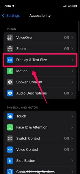 3。タップします表示とテキストサイズ次のページのオプション。
