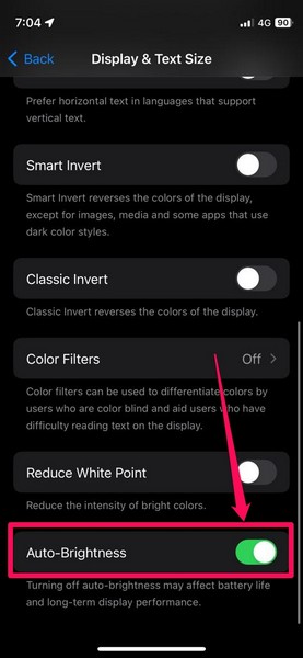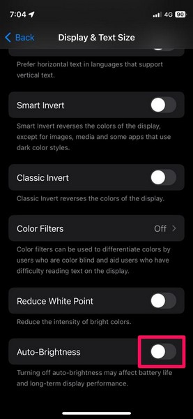 4。次に、下にスクロールして、を見つけます自動明度オプションとその横にあるトグルをタップして、iPhoneの機能を無効にします。