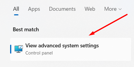 1。そうするために、を開きますWindows検索バー、 タイプ高度なシステム設定を表示します、そして押します入力鍵。