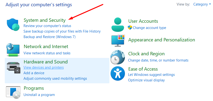 1。開きますコントロールパネルアプリしてクリックしますシステムとセキュリティ。