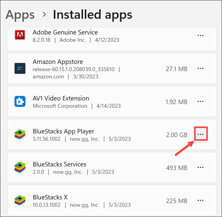 3。を探しますBlueStacksアプリプレーヤーそして、その隣の3つのドットアイコンをクリックします。