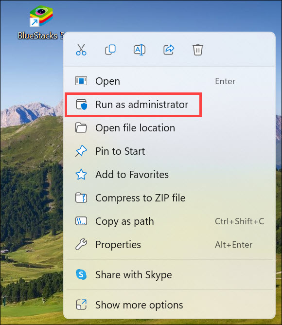 1。Bluestacksショートカットを右クリックして選択します管理者として実行しますコンテキストメニューから。