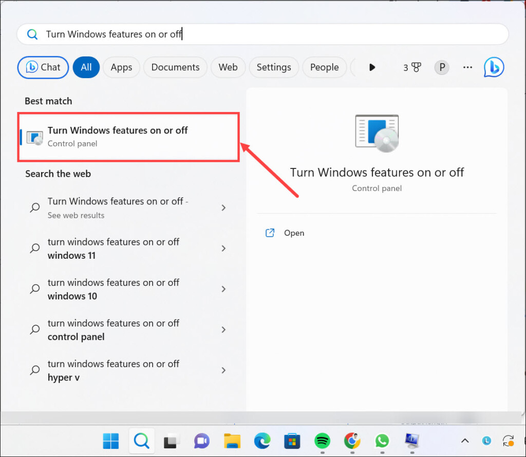 1。Windows 11の検索ボックスに、「」と入力します。Windowsの機能をオンまたはオフにします」そして、そのアイコンをクリックして起動します。