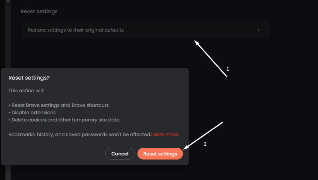 1。に移動します設定勇敢なブラウザと選択の領域設定をリセットします左ペインから。