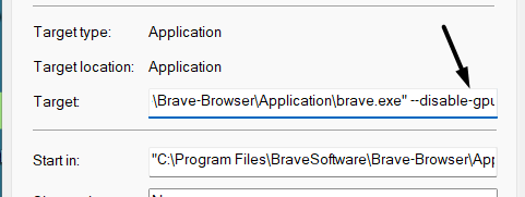 2。に行きますショートカットタブとタイプ–Disable-GPUの場所の終わりにターゲット分野。