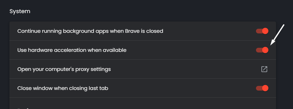 このため、お勧めします勇敢なブラウザのハードウェアアクセラレーションを無効にします。以下のリストに載った手順に従って、同じことを簡単に行うことができます。