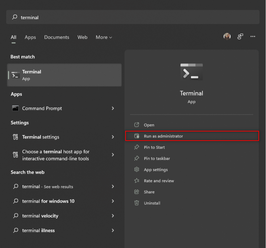 2。をクリックします管理者として実行します下のボタンターミナル管理者の権利でそれを開くため。