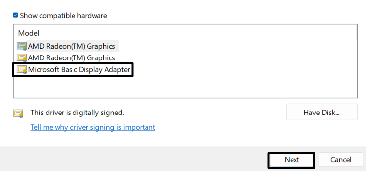 5。次の画面で、選択しますMicrosoft Basicディスプレイアダプタークリックします次ドライバーのインストールプロセスを継続します。