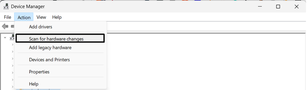 2。モニタードライバーがシステムからアンインストールされたら、もう一度ドライバーを選択して、クリックしてくださいアクショントップメニューで、選択しますハードウェアの変更をスキャンします統合されたモニタードライバーを再インストールします。