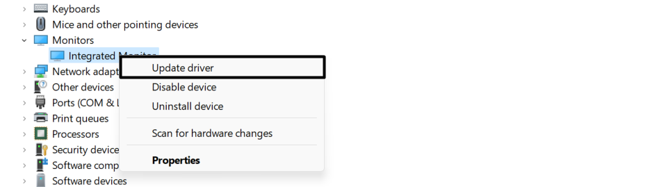 1。モニタードライバーを更新するには、右クリックしますの統合されたモニタードライバーでモニターセクション をクリックしますドライバーを更新しますオプション。
