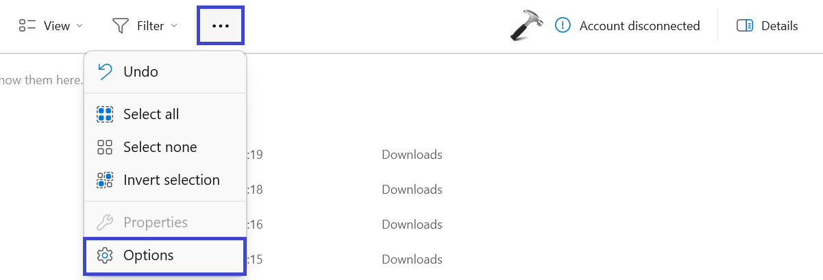 1。ファイルエクスプローラーを開きます。 3つの水平ドット(…)をクリックして、「」を選択します。オプションメニューから。