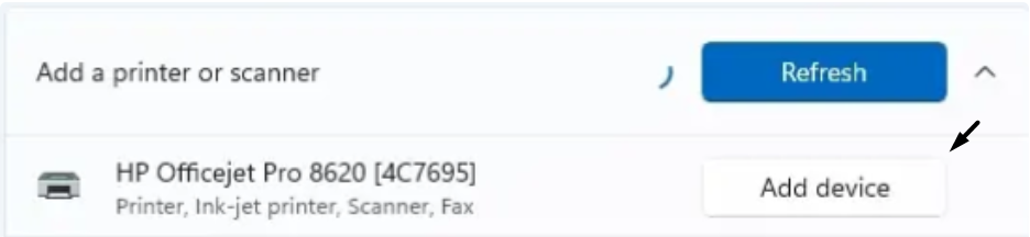 5。完了したら、マシンを選択してクリックしますデバイスを追加しますプリンターをPCにペアリングするボタン。