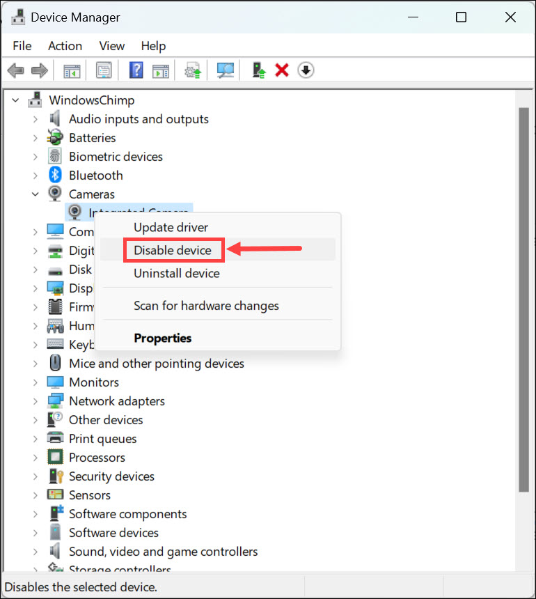 3。外部ウェブカメラデバイスを右クリックして選択しますデバイスを無効にします。