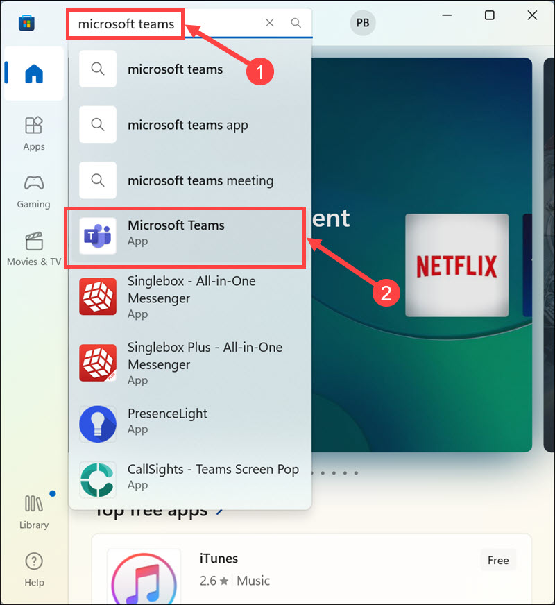 6。タイプしますマイクロソフトチーム検索で、そのアイコンをクリックして起動します。