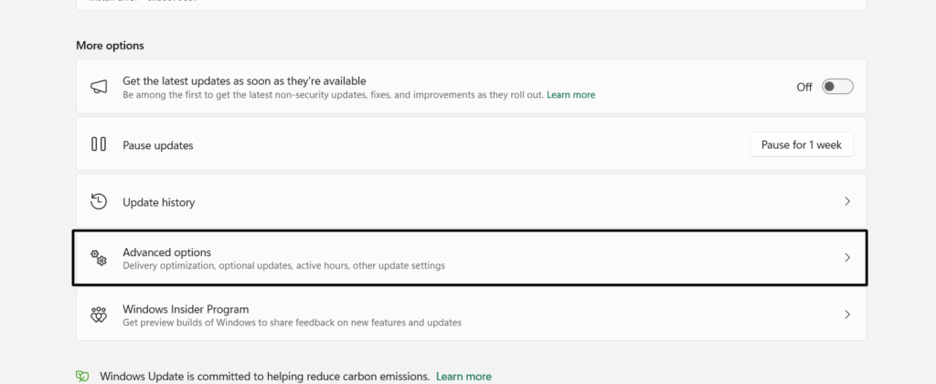 2。でWindows Updateウィンドウ、選択高度なオプション選択しますオプションの更新。