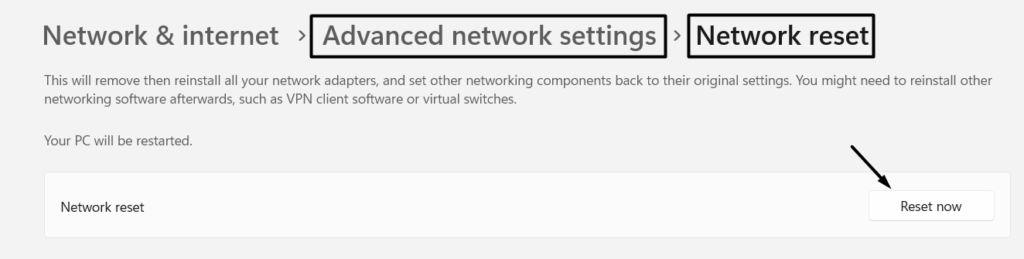 3。最後に、 選ぶネットワークリセット、次にクリックします今すぐリセットします隣のボタンネットワークリセット。