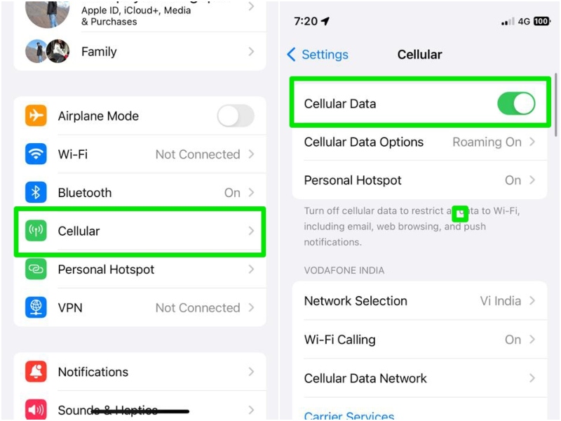 再起動に続いて、iPhoneでセルラーデータを有効にして、インターネットが機能しているかどうかを確認します。