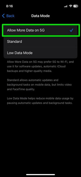 5。次に、タップします5Gのより多くのデータを許可しますオプション。