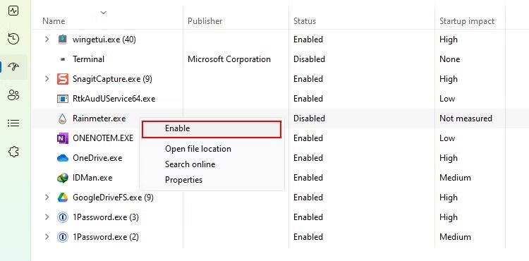 ステップ3:下の雨量計を右クリックします名前エントリ選択します有効にする。