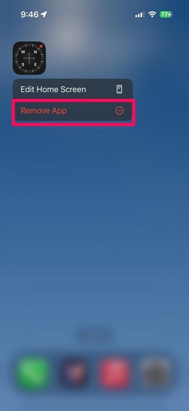 2。コンパスアプリのアイコンをタップして保持しますコンテキストメニューを表示して選択しますアプリを削除しますオプション。