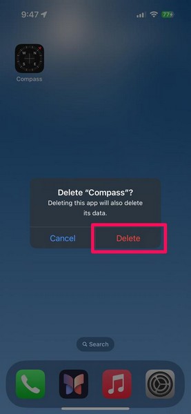 4。 あなたの行動を確認してください次のプロンプトで、iPhoneからコンパスアプリをアンインストールします。