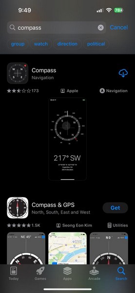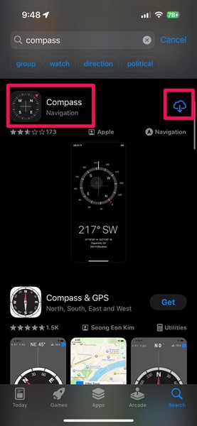 7。を見つけますコンパスアプリ検索結果でタップしますダウンロードボタン(下向きの矢印のあるクラウド)その隣。