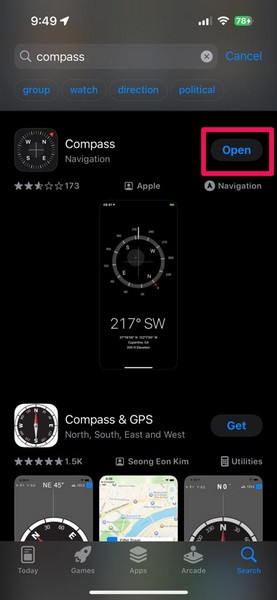 8。コンパスアプリが再インストールされたら、タップします開けるデバイスで起動するボタン。