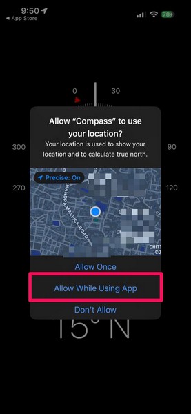 9。選択しますアプリの使用中に許可します場所 - アクセスプロンプト。
