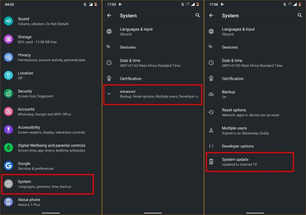 行きます設定>システム>高度な>システムの更新デバイスがソフトウェアの更新をスキャンするのを待ちます。