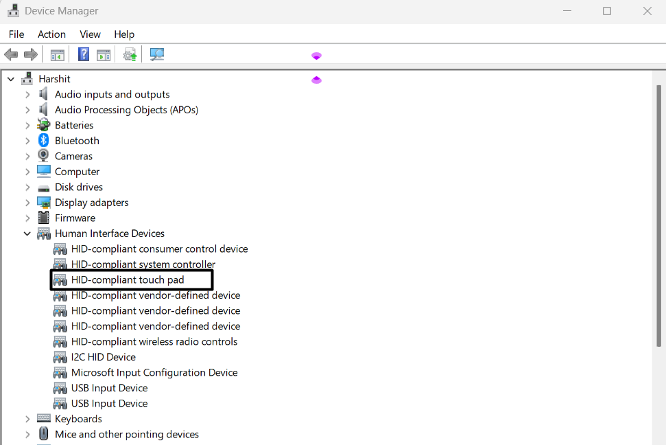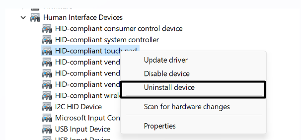 2。で人間のインターフェイスデバイスセクション、タッチパッドドライバーを右クリックして、コンテキストメニューを取得します。