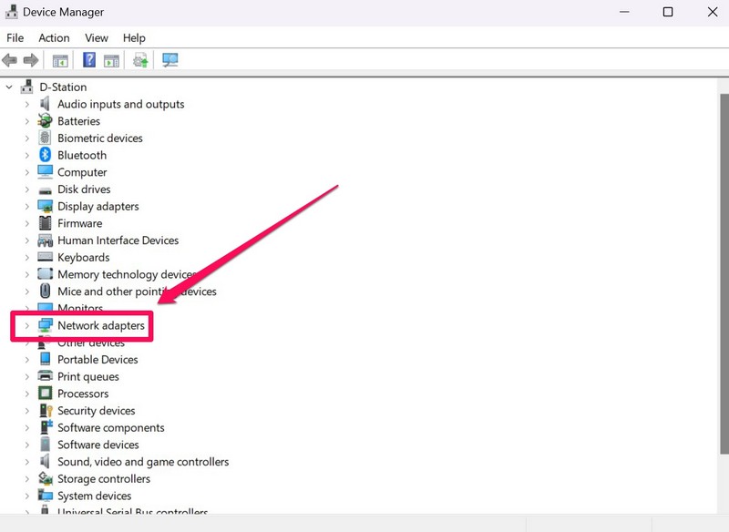 2。を見つけますネットワークアダプターオプションと小さな矢印をクリックします拡張するためにそれの横に。