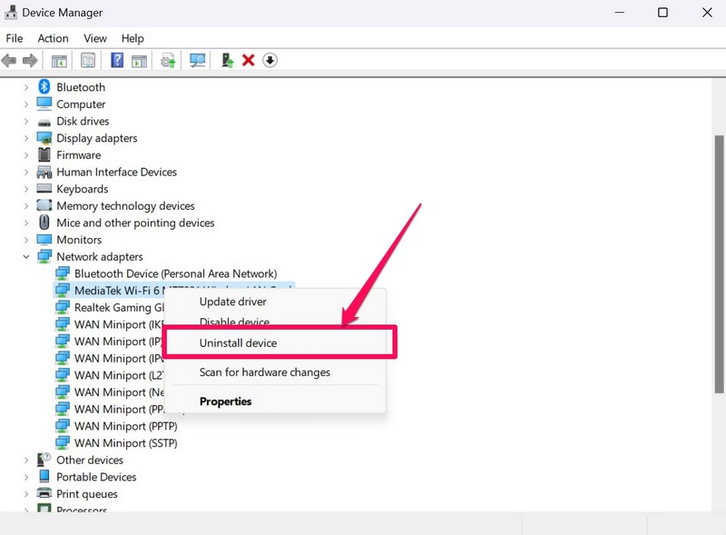 上記のソリューションがWindows 11デバイスでDHCPを修正できなかった場合、PCまたはラップトップのネットワークアダプターを再インストールしてみてください。 Windows 11のネットワークアダプターのアンインストールと再インストールにより、多くのネットワークの問題が修正され、アダプターが更新されます。