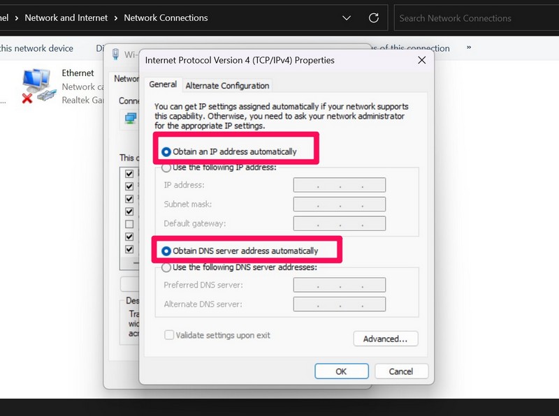 Windows 11でDHCPを有効にするには、Active Network接続のIPv4プロパティを開き、IPアドレスとDNSサーバーアドレスを取得するために自動テンプレートに切り替える必要があります。