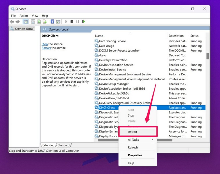 4。右クリックしますDHCPクライアントをクリックします再起動コンテキストメニューのオプション。