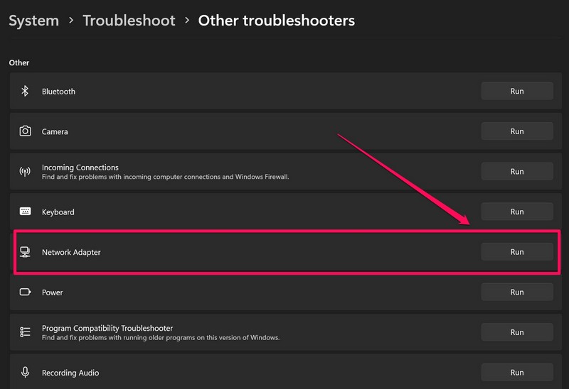 4。を見つけますネットワークアダプター次のリストのオプションをクリックします走るその横にあるボタン。
