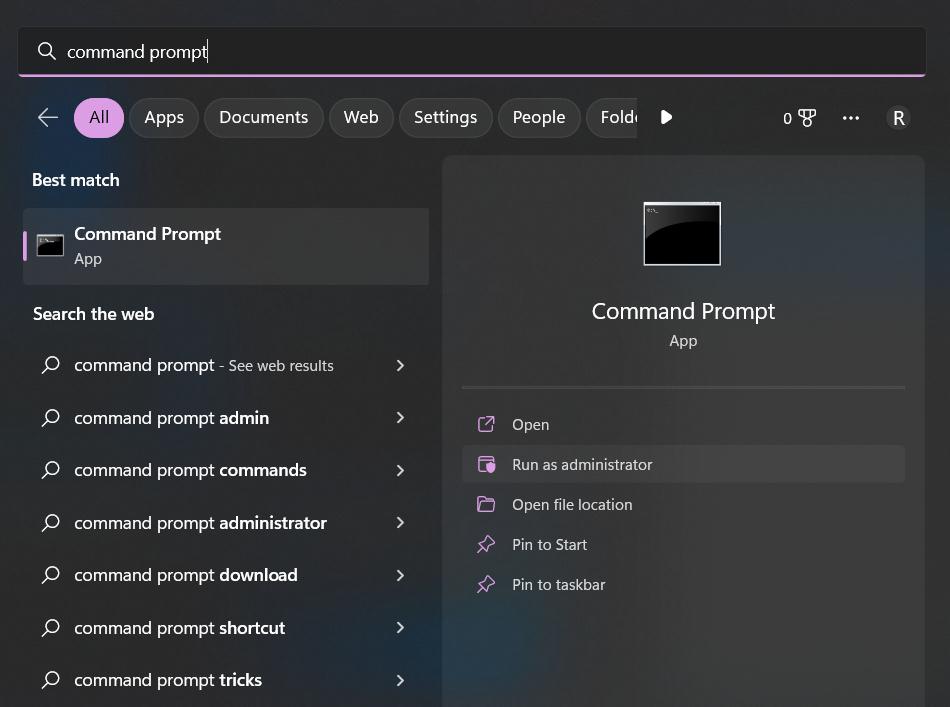 ステップ1:タスクバーに配置された検索アイコンをタップし、「」と入力します。コマンドプロンプト」そして、クリックします。管理者として実行します」Adminモードでアプリを起動するオプション。