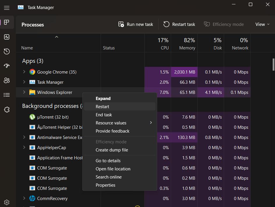 ステップ2:[タスクマネージャー]ウィンドウで、「」に切り替えます。プロセス」タブ、そして探してWindowsエクスプローラー」。