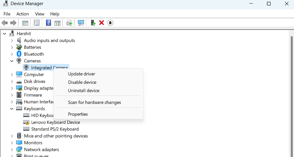 3。でデバイスマネージャ、拡張しますカメラセクション、右クリックします統合カメラ。