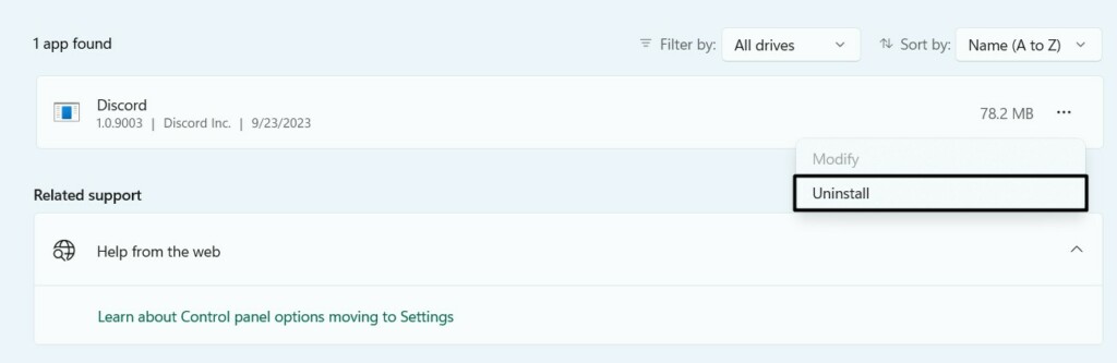 3。クリックします3つのドット(…)の隣不一致アプリ選択しますアンインストールメニューからオプション。