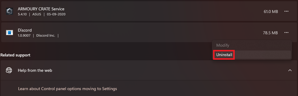 2。不一致に移動し、クリックしますミートボールのメニューアイコン、およびアプリのアンインストール。