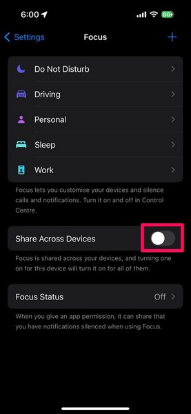 トリガーできるもう1つのフォーカス設定は、iPhoneを自動的にオンにするために邪魔しないことが、デバイス全体の共有オプションです。フォーカスのためのデバイスのセットを介した共有は、基本的に、Apple IDで署名されたすべてのデバイスですべてのフォーカスモードと構成をシームレスに共有する機能です。