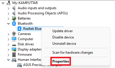 2。拡張しますブルートゥースセクション、を右クリックしますBluetoothアダプター、および選択しますプロパティ。