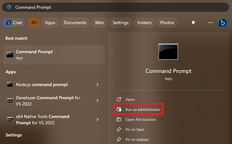 1。検索するコマンドプロンプト[スタート]メニューの検索バーでクリックします管理者として実行しますオプション。