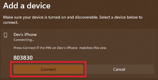 6。確認として、クリックします接続するコンピューターのボタンは、電話をペアリングします。
