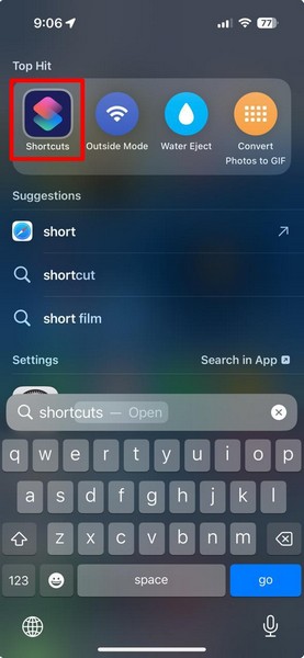1。 ショートカットアプリを見つけますあなたのiPhoneでタップして開きます。