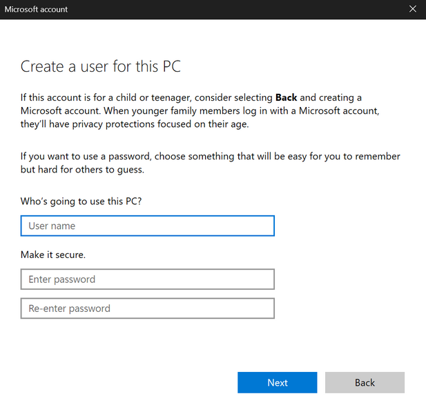 6。今、必要な情報を提供しますそして画面上の指示に従ってくださいPCまたはラップトップに新しいWindowsユーザーアカウントを作成します。