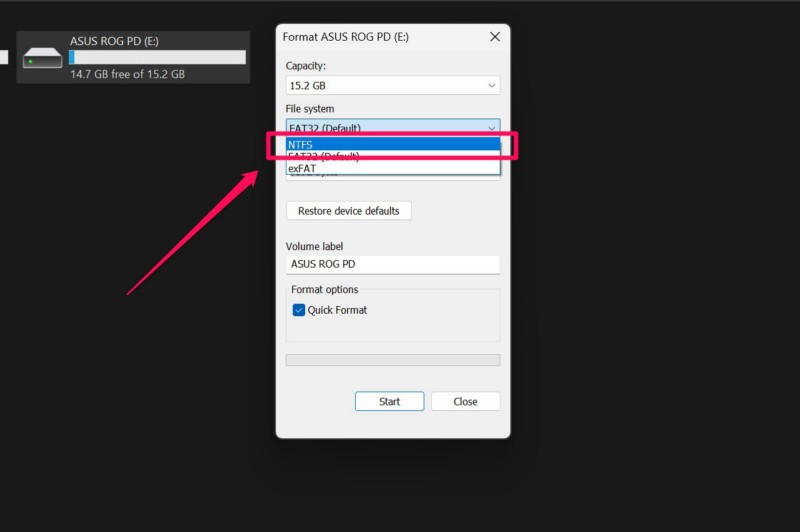 5。次のドロップダウンメニューで、を選択しますNTFSオプション、デフォルトのFAT32よりもアップグレードされたファイルシステムです。