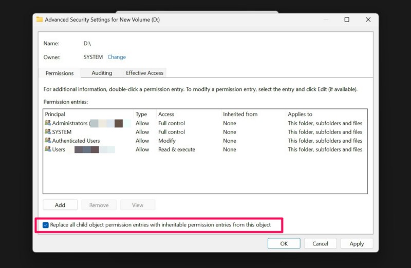 8。最後に、外部ドライブの[高度なセキュリティ設定]ウィンドウ内で、すべての子オブジェクトの許可エントリを、このオブジェクトからの継承可能な許可エントリに置き換えますオプション。