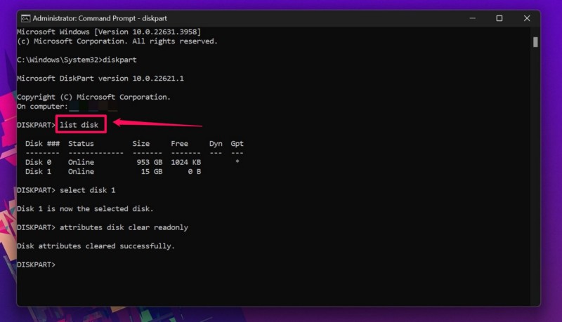 7。ディスクパートで外部ディスクドライブが選択されたら、次のコマンドを入力しますEnterを押します読み取り専用形式を無効にしますそれのために:
