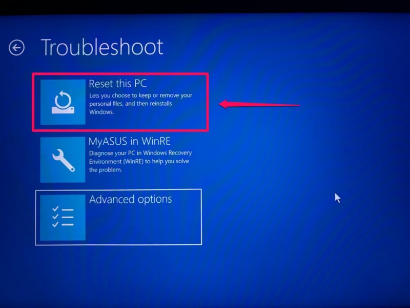 3。次のページで、を選択しますこのPCオプションをリセットしますEnterボタンを押してプロセスを開始します。
